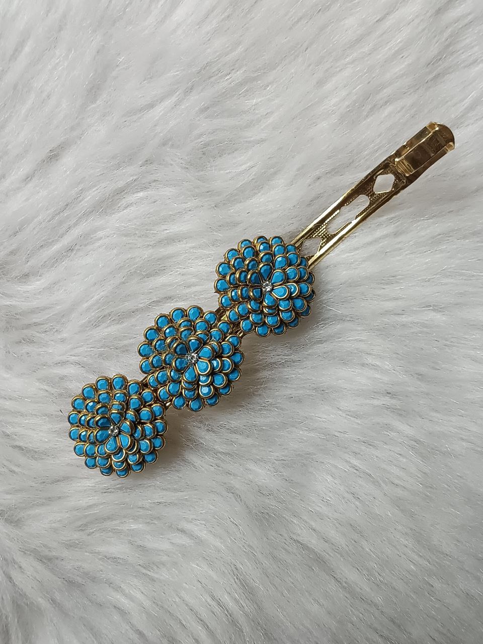 Add a touch of elegance and charm to your hairstyle with this stunning turquoise floral stone hair clip. Designed with intricate flower patterns and a premium gold-tone finish, this barrette enhances your traditional and modern looks effortlessly. The vibrant turquoise stones arranged in a delicate floral design create a graceful and luxurious appeal, making it perfect for festive occasions, weddings, and special events.