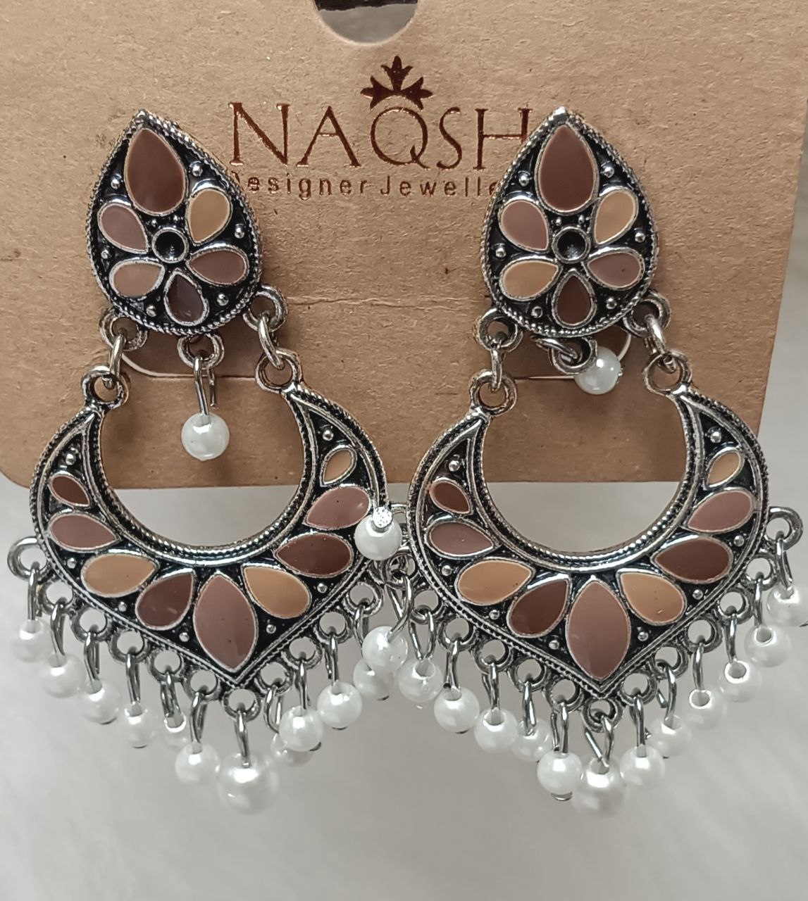 These antique silver-tone drop earrings showcase a graceful blend of beige and brown enamel accents arranged in a floral-inspired pattern. The teardrop stud top flows into a crescent-shaped drop, beautifully highlighted with enamel work and finished with multiple pearl dangles that add gentle movement and charm.