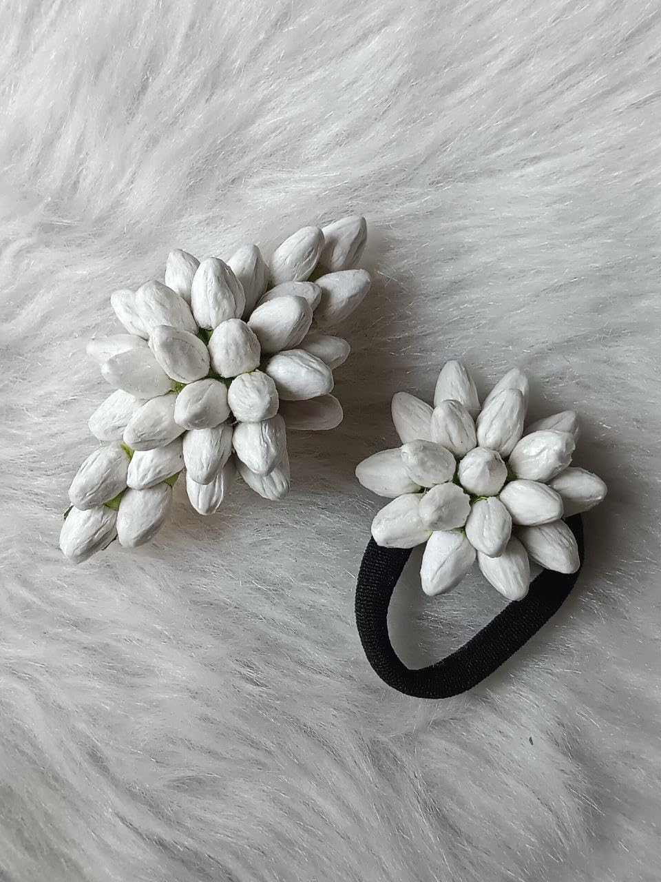 Add timeless floral elegance to your hairstyles with this artificial jasmine buds hair accessory set. Featuring delicately crafted white jasmine-inspired buds, this set includes a soft elastic hair tie and a matching floral clip for versatile styling. The lightweight design offers comfort and a secure hold, making it perfect for buns, ponytails, and half-up styles. Ideal for daily wear, festive occasions, and special moments, this set blends classic charm with modern practicality.