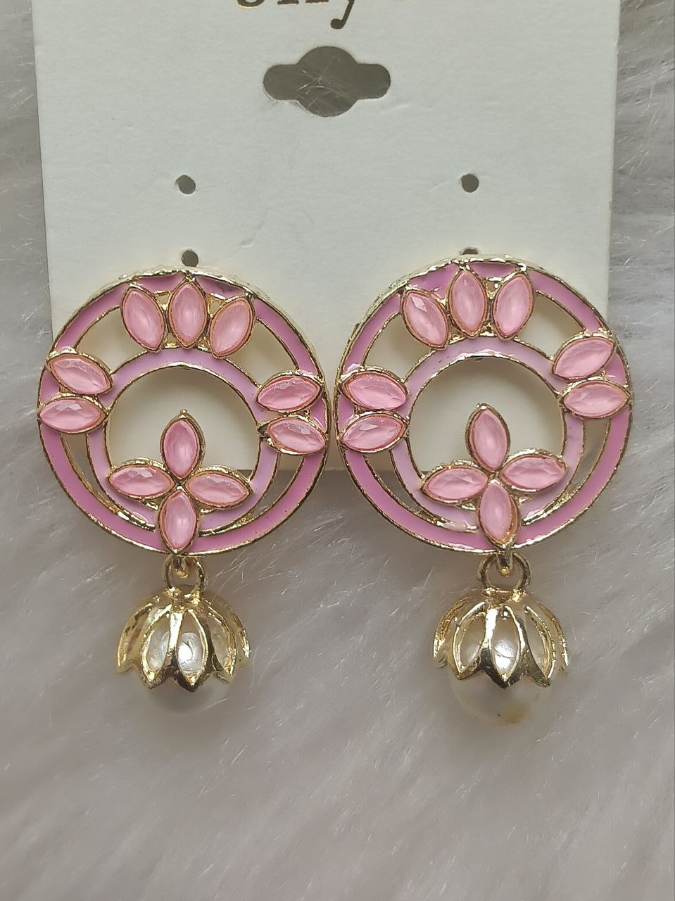 These elegant baby pink circular floral earrings feature marquise-cut stone petals arranged in a wreath pattern around a glossy enamel ring. Finished with a dangling gold lotus-shaped charm and pearl drop, they bring graceful movement and festive sparkle to ethnic and fusion looks.