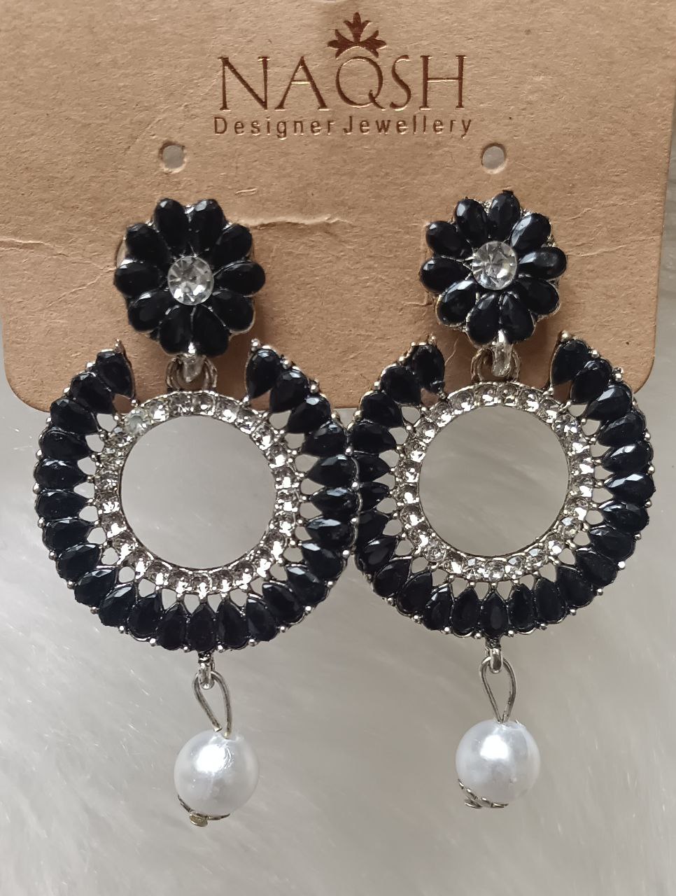 Make a bold yet elegant statement with these black crystal floral circle drop earrings. Featuring a glossy black flower stud accented with a sparkling crystal center, the design flows into a circular drop framed with black marquise crystals and shimmering clear stones. Finished with a classic white pearl dangle, these earrings blend glamour and sophistication—perfect for evening wear and festive occasions.