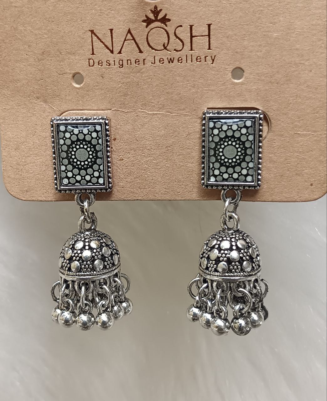 Elevate your ethnic style with these Black & Grey Enamel Silver Oxidized Jhumka Earrings. The square stud showcases a refined geometric enamel pattern in classic black and grey tones, perfectly paired with a traditional oxidized silver jhumka. Intricate detailing on the dome and playful dangling bead chains add movement and charm, making these earrings an elegant choice for festive occasions and everyday ethnic wear.
