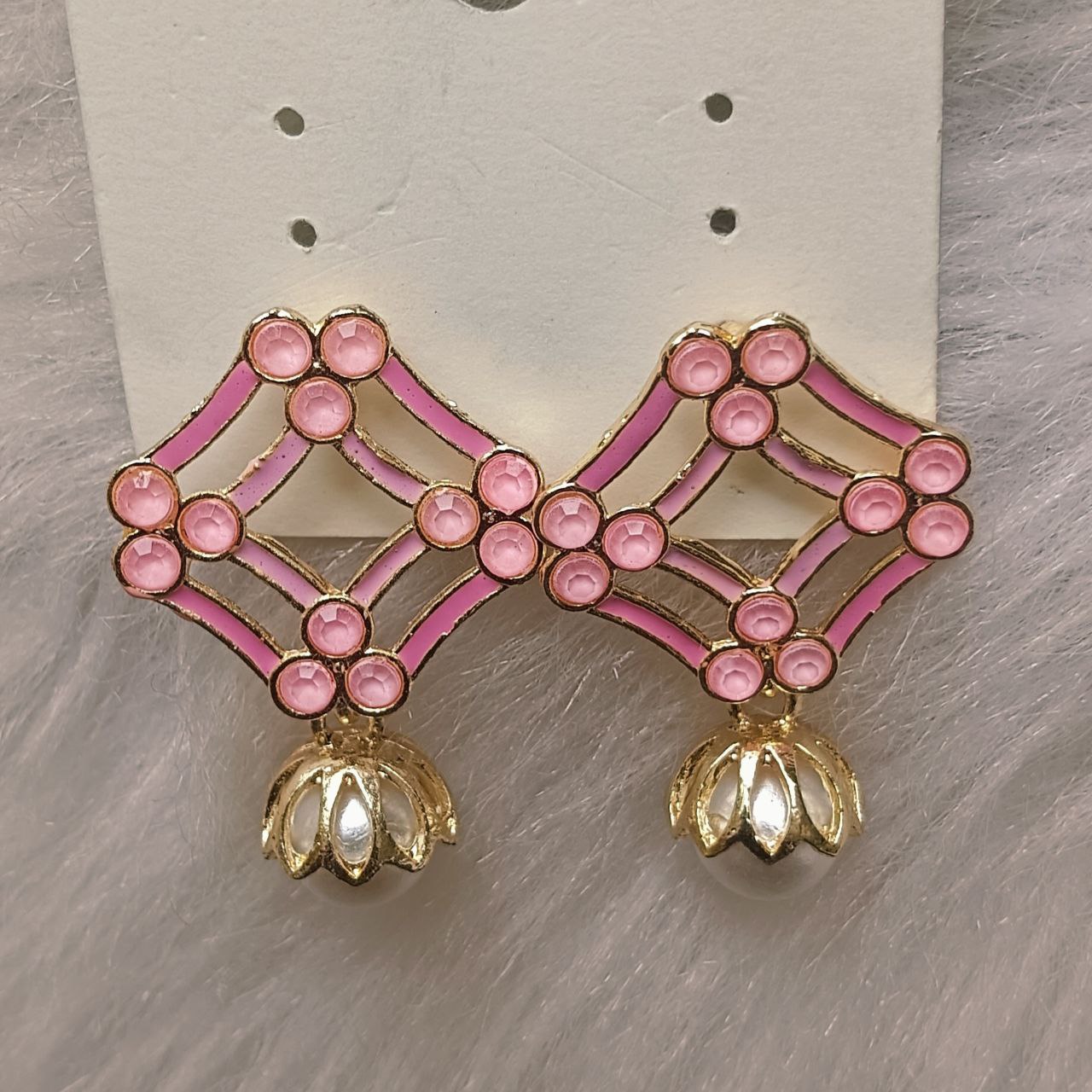 Charming and feminine, these blush pink enamel earrings feature diamond-shaped frames with glossy stones and a lotus-style pearl drop, beautifully set in gold-tone metal.