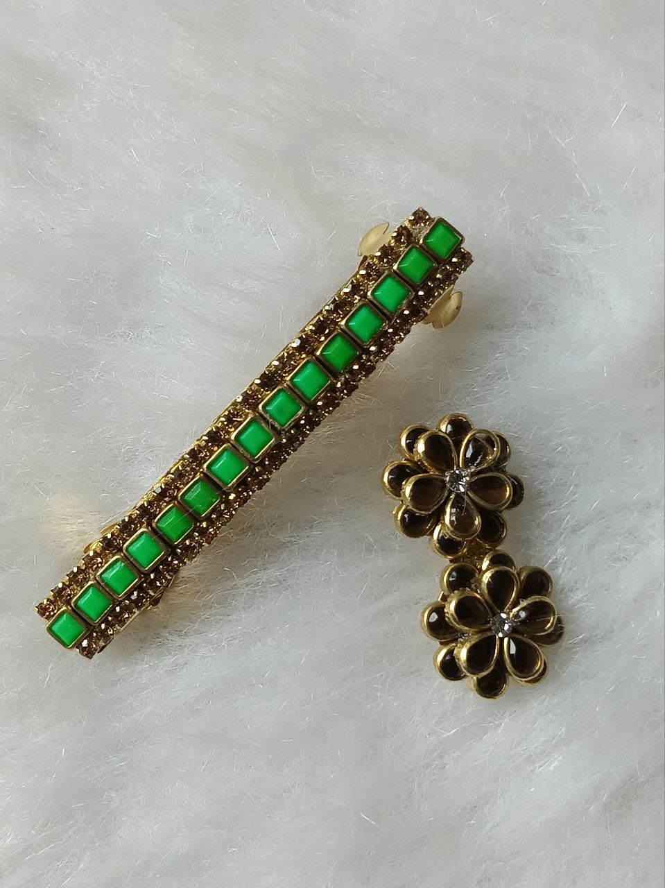 Bring a touch of timeless elegance to your traditional styling with this beautifully coordinated 2.07-inch barrette hair clip and saree pin set. The sleek rectangular barrette features vibrant green square stones framed in a textured gold-tone finish, creating a refined and graceful look. Paired with a matching floral saree pin accented with a subtle crystal center, this set is designed to complement festive, wedding, and party-wear outfits. Lightweight and secure, it offers both comfort and style for all-day wear.