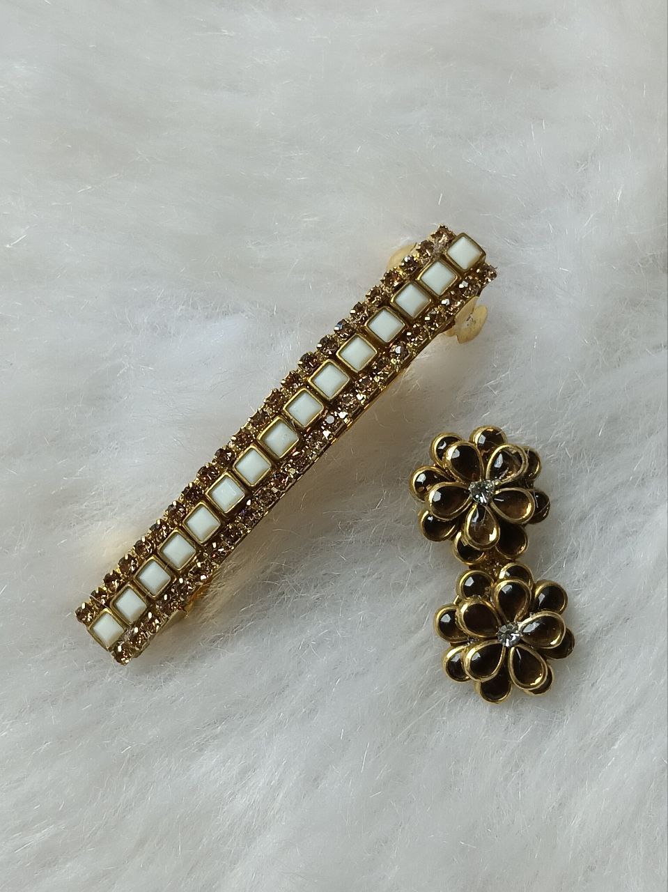 Brighten your ethnic and festive styling with this elegant 2.07-inch barrette hair clip and matching saree pin set. The slim rectangular barrette is adorned with vibrant white square stones, beautifully framed by a textured gold-tone finish and sparkling accents. Complemented by a floral saree pin with a crystal center, this coordinated set adds a cheerful yet graceful touch to sarees, festive outfits, and special occasions. Lightweight and secure, it offers comfortable wear throughout the day.