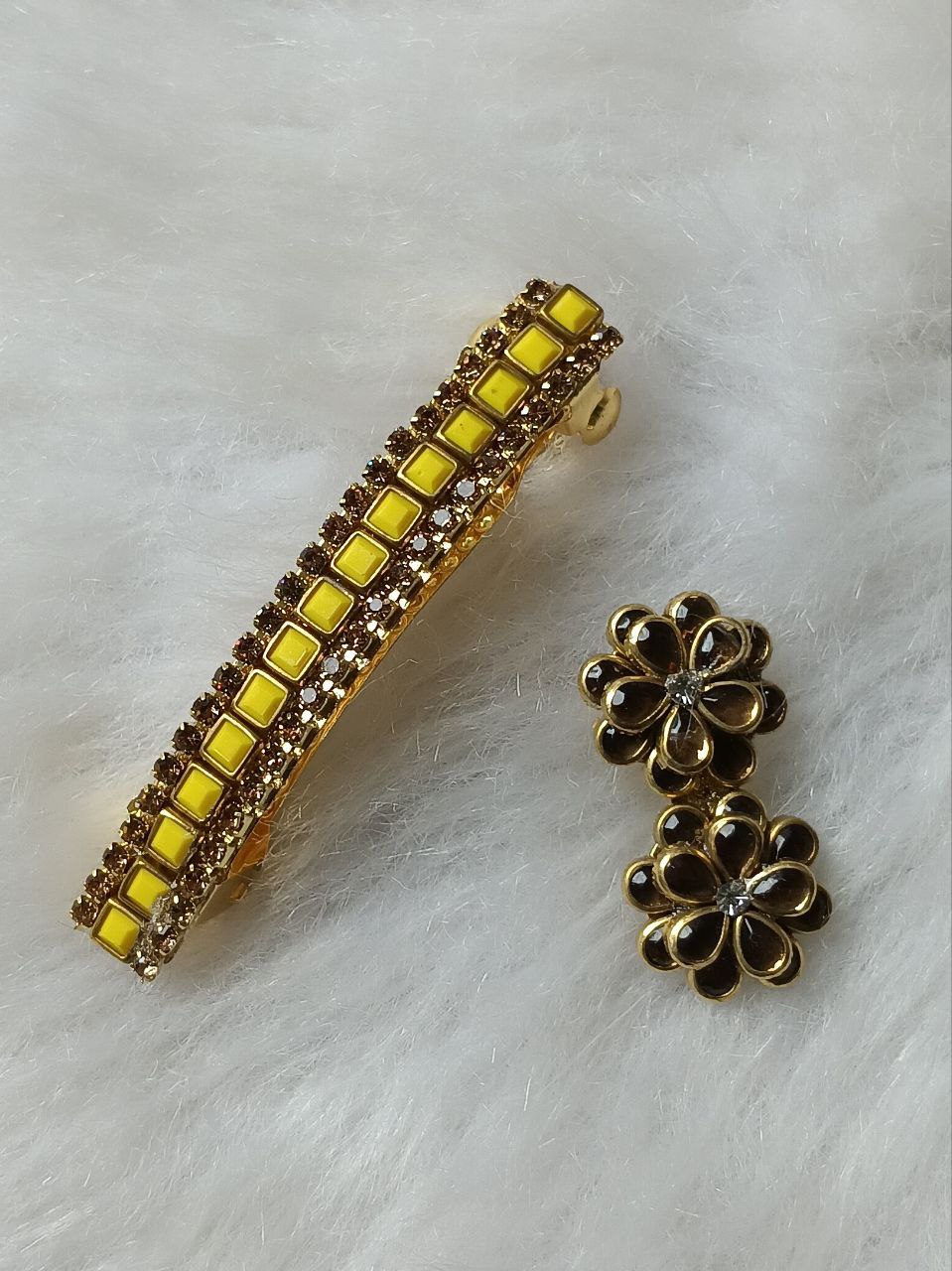 Brighten your ethnic and festive styling with this elegant 2.07-inch barrette hair clip and matching saree pin set. The slim rectangular barrette is adorned with vibrant yellow square stones, beautifully framed by a textured gold-tone finish and sparkling accents. Complemented by a floral saree pin with a crystal center, this coordinated set adds a cheerful yet graceful touch to sarees, festive outfits, and special occasions. Lightweight and secure, it offers comfortable wear throughout the day.