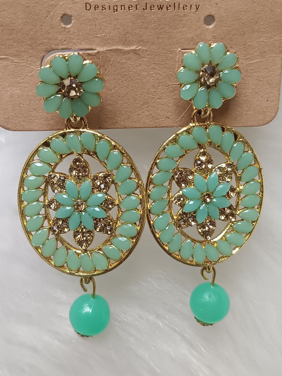 Add a refreshing pop of color to your look with these mint green floral circle drop earrings. Designed with delicate petal-shaped stones arranged in floral patterns, the earrings feature an elegant open circular frame highlighted with sparkling crystal accents. Finished with a smooth mint green bead dangle and a rich gold-tone base, this pair brings together charm, elegance, and festive appeal—perfect for celebrations and stylish outings.