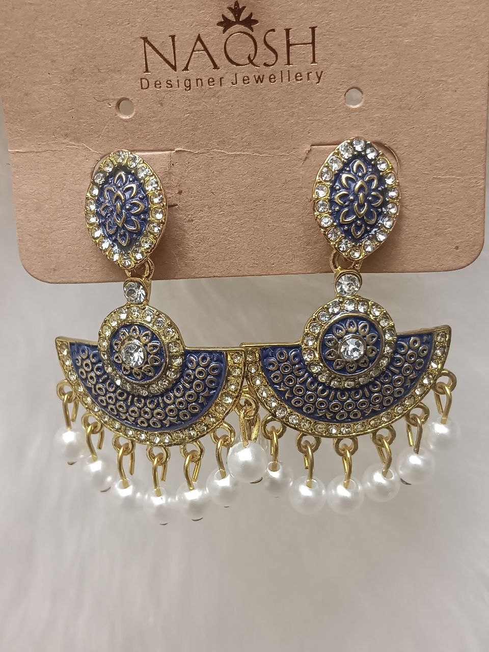 These Navy Blue & Gold Enamel Pearl Drop Earrings feature rich blue enamel detailing paired with a radiant gold-tone finish. The traditional fan-shaped design is enhanced with sparkling stone accents and finished with elegant pearl danglers, making them perfect for festive and evening ethnic wear.