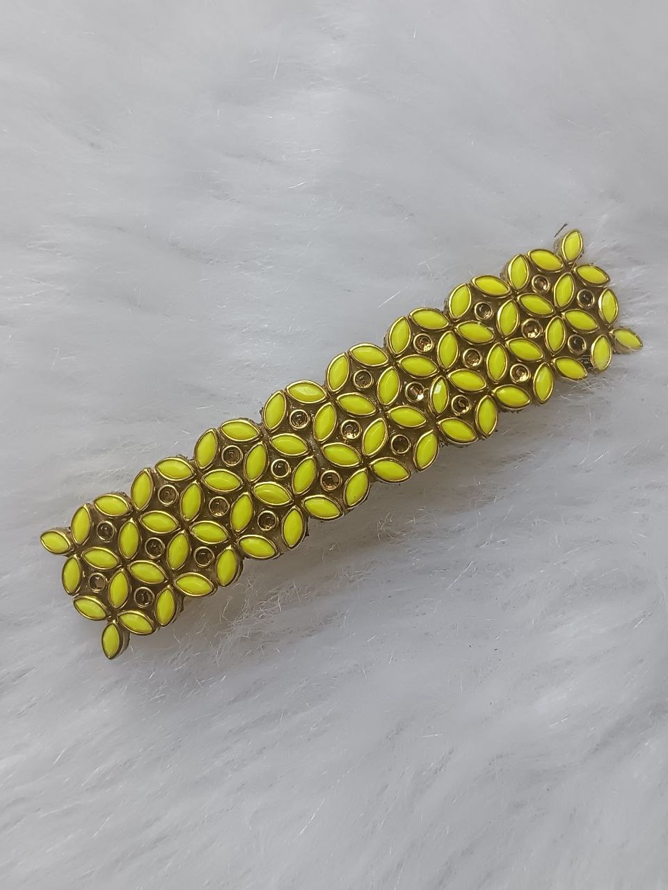 Bright neon yellow stone hair clip with gold finish and strong hold – perfect for festive styling.