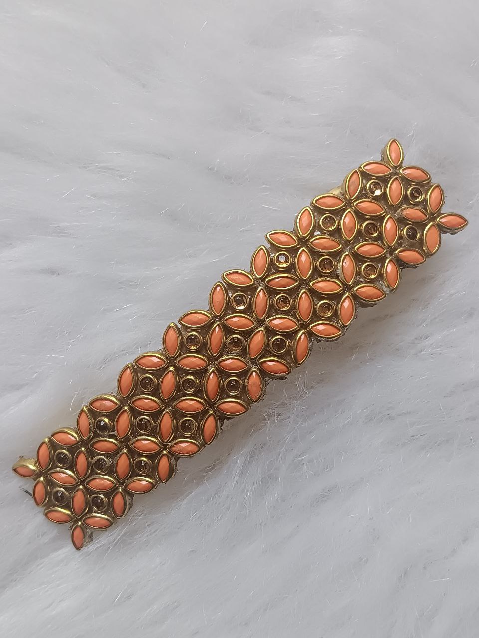Add a warm and elegant touch to your hairstyle with this peach orange designer stone hair clip. Designed with a premium gold-tone base and detailed leaf-shaped peach stones, this 3.07-inch barrette provides a secure grip while remaining lightweight and comfortable. Perfect for festive occasions, weddings, parties, and traditional wear, this vibrant accessory enhances both ethnic and fusion outfits beautifully.