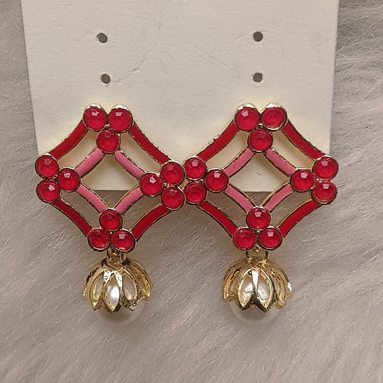 Bold and festive, these ruby red enamel earrings showcase geometric diamond frames adorned with glossy stones and a lotus-style pearl drop for a striking traditional look.