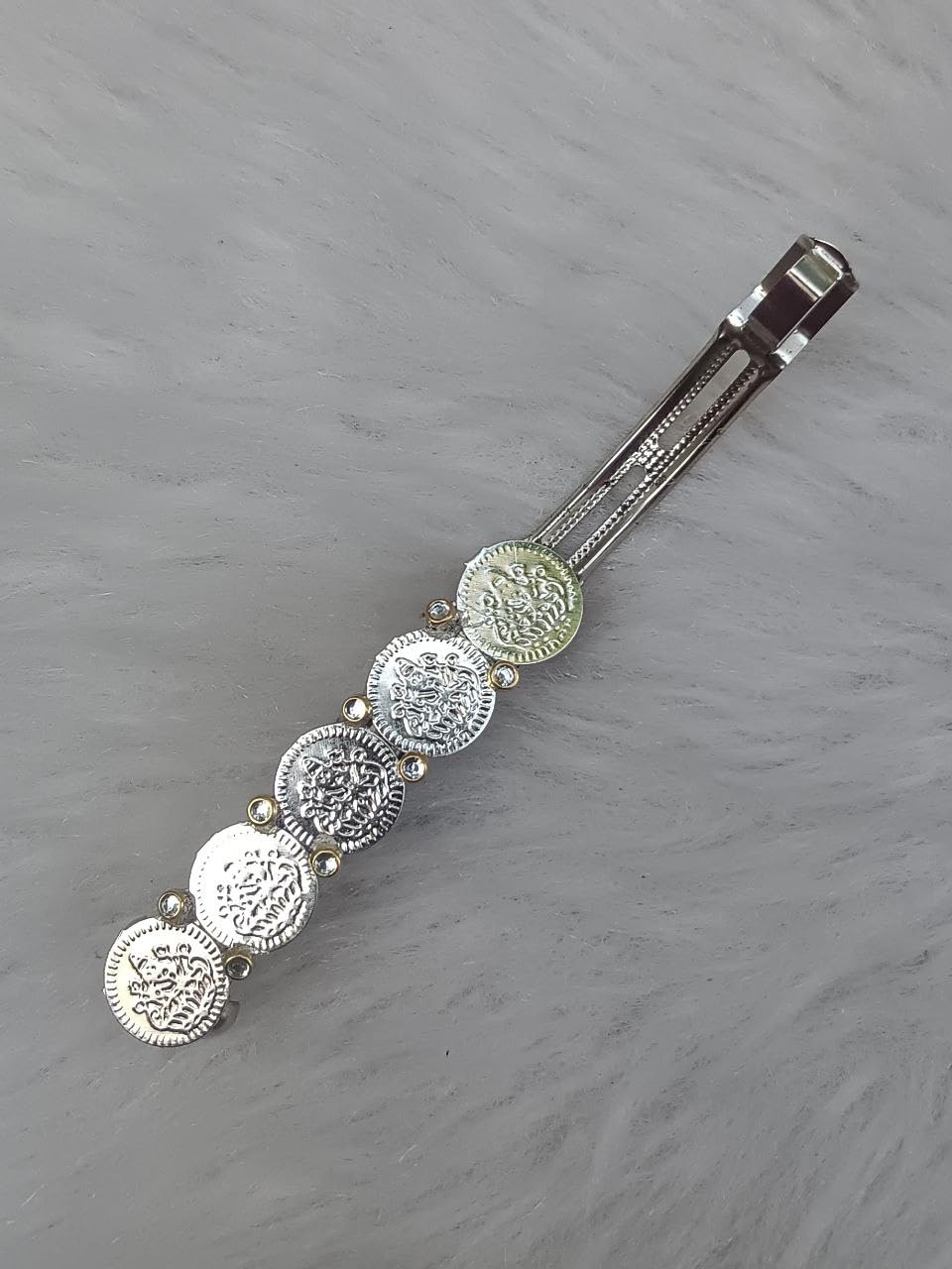 Add a graceful ethnic touch to your hairstyle with this Silver Coin Barrette Hair Clip. Featuring beautifully crafted vintage coin detailing, this accessory blends traditional charm with modern elegance, making it a perfect addition to your collection.
