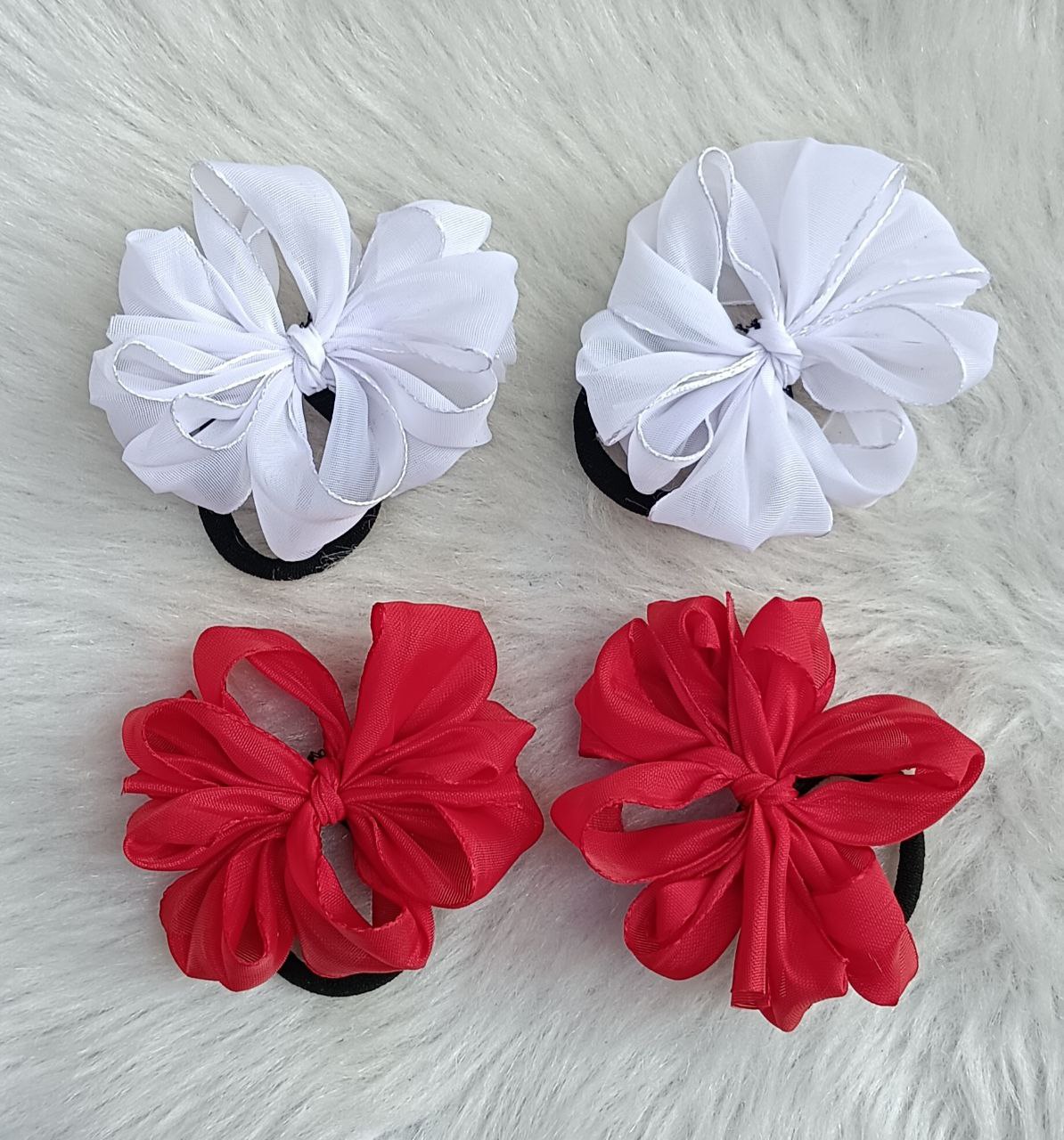 Add elegance and colour to everyday hairstyles with this set of two chiffon flower hair ties in classic white and vibrant red. Designed with layered fabric petals and strong black elastic bands, these scrunchies keep ponytails, braids, and buns neat and secure while adding a stylish floral touch.